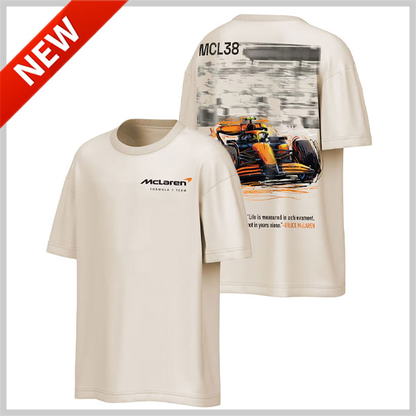 背面にチームマシン「MCL38」のグラフィックと、”Life is measured in achievement not in years alone.”(人生は年月だけではなく、成し遂げたことで測られる)というメッセージがプリントされています。
