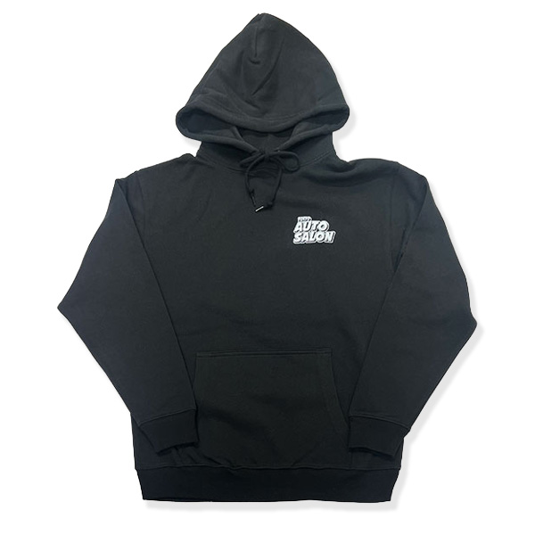 タイヤの前でにっこり笑顔で寄り添うトムとジェリーを描いた、東京オートサロン限定デザインのフーディーです。