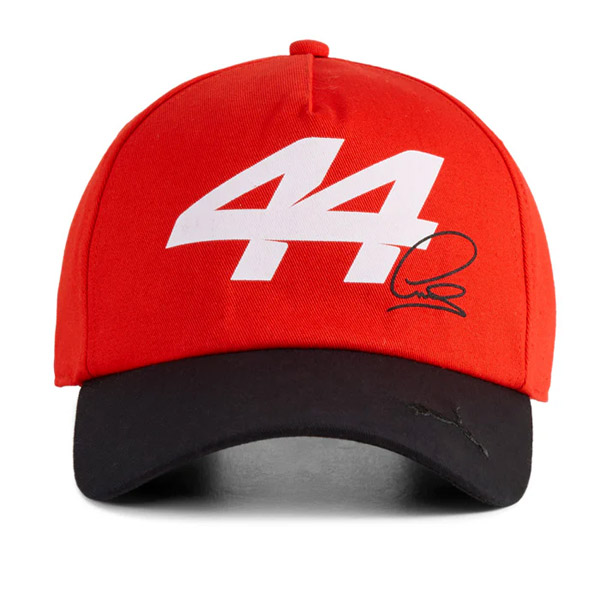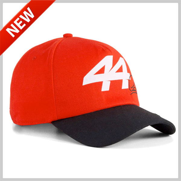 ハミルトンのドライバーナンバー『44』とサインを大胆にあしらった、スクーデリア・フェラーリのベースボールキャップです。