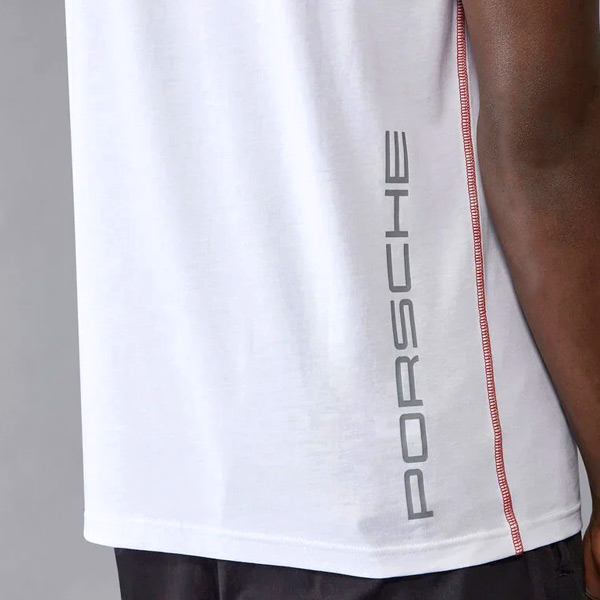 ネック内側にはポルシェを象徴するレッドカラーのラインを配し、サイドの背面側には「PORSCHE」ロゴプリントをレイアウト。さらに、サイドシームにはコントラストの効いた赤いカバーステッチを施し、スポーティーなアクセントを加えています。