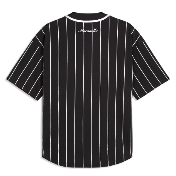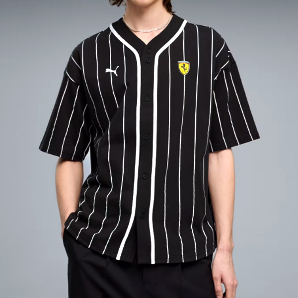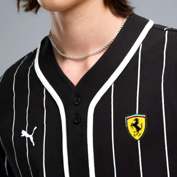 伝統ある Scuderia Ferrari を象徴する、印象的なベースボールジャージのシャツです。やわらかく伸縮性のあるシングルジャージ素材を採用しています。象徴的なブラックに、ホワイトストライプを組み合わせたスポーティなデザインが特徴です。